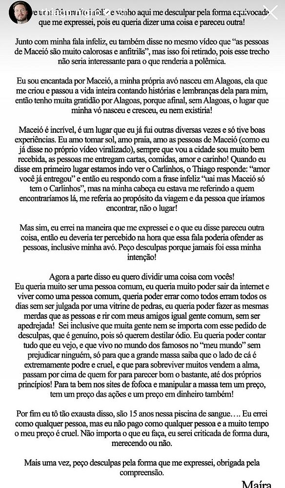 Por fim, Maíra Cardi usou as redes sociais do marido, o influenciador digital Thiago Nigro, o primo rico, para se desculpar. Ela disse reconhecer a fala como infeliz, mas alega que foi tirada de contexto. Cardi também se disse encantada por Maceió e que a avó nasceu em Alagoas; veja abaixo: