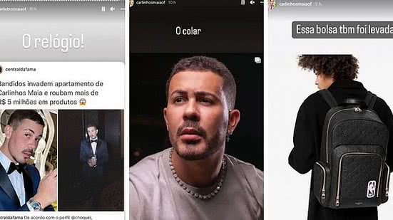 Em seu perfil no Instagram, o alagoano compartilhou as fotos de um relógio, um colar e uma mochila. De acordo com o colunista Léo Dias, do Metrópoles, Lucas Guimarães, marido de Carlinhos, disse que ele e o companheiro estão desconfiando de algumas pessoas próximas a eles, principalmente após alguns fatos da noite do crime não fazerem muito sentido, como o alarme do prédio ser acionado assim que o apartamento foi invadido.