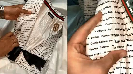 A solução encontrada pelo estilista Audifax foi fazer dois ternos inteiros com os nomes de seguidores do casal. Ele contou, ao entregar os presentes, que foram oito metros de tecido para fazer os conjuntos e garantiu não ter nenhum nome repetido. "Passei noites sem dormir porque queria mostrar o amor de seus seguidores", disse.