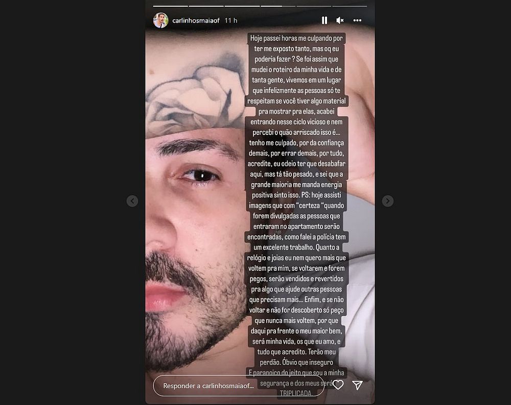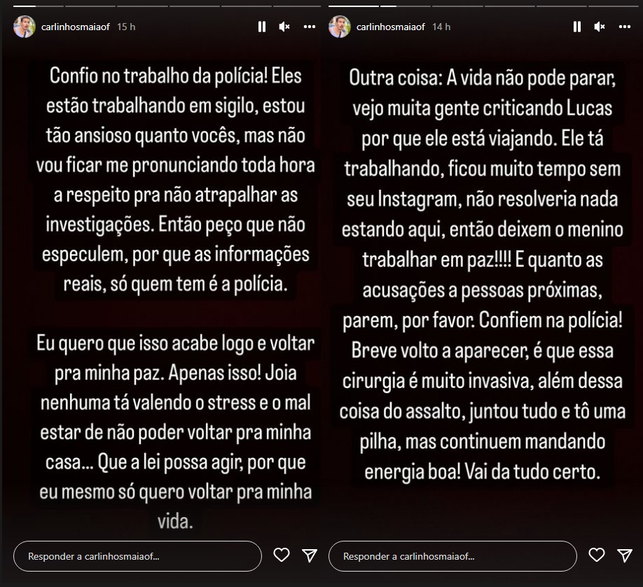 Na sequência das postagens, o influenciador destacou que assistiu a um vídeo que seria determinante, segundo ele, para identificação dos suspeitos do assalto. "Hoje assisti imagens que com certeza quando forem divulgadas as pessoas que entraram no meu apartamento serão encontradas. Como falei, a polícia tem um excelente trabalho".