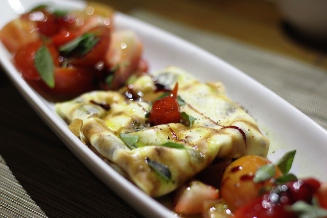 Crepioca Caprese tem uma bela apresentação, a massa é macia, dobrada