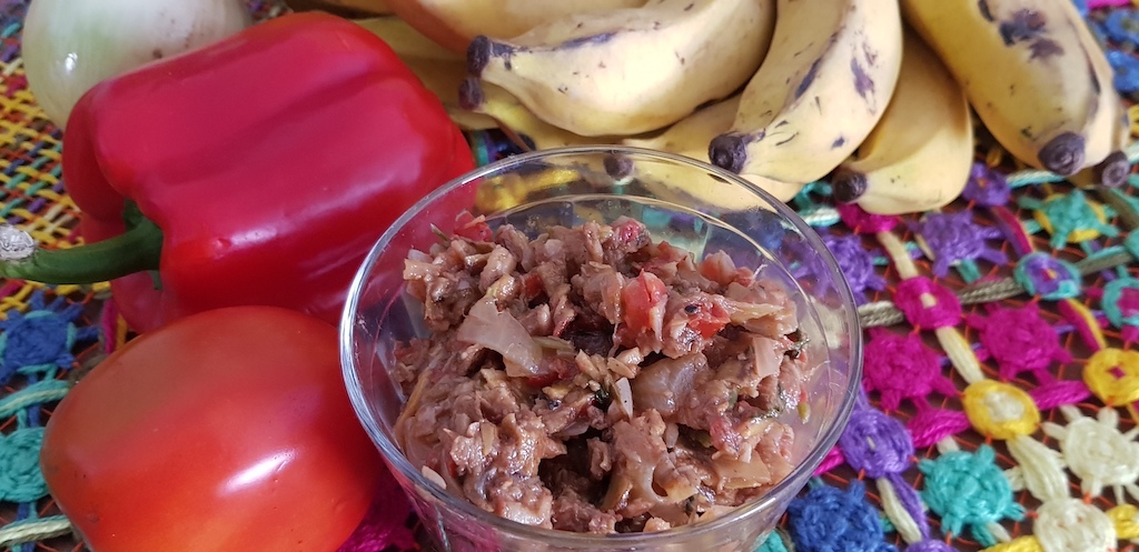 Casca de banana temperada com ingredientes de carne guisada é muito bom