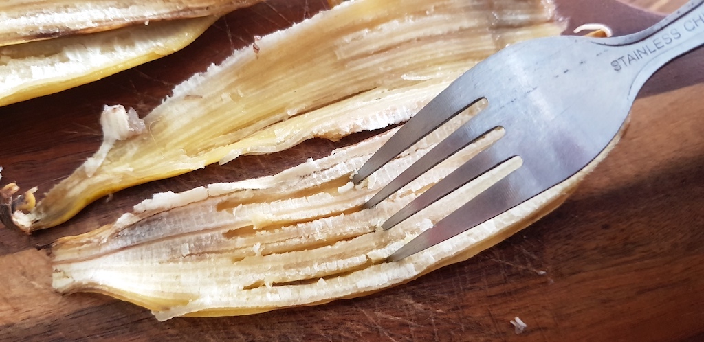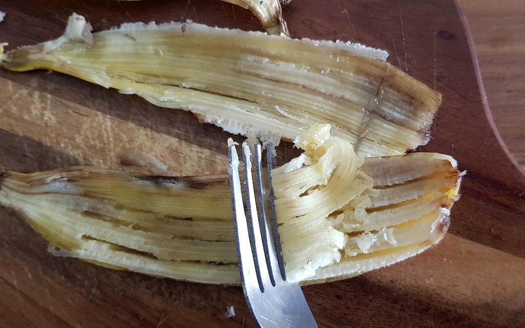 Arranhe a parte branca da casca de banana com ajuda de um garfo