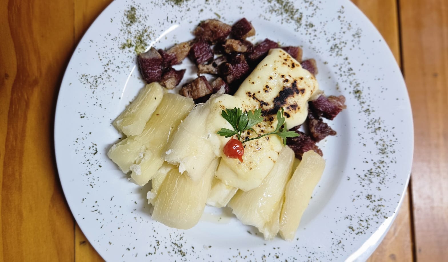 Para jantar: charque, macaxeira, queijo coalho e carne do sol