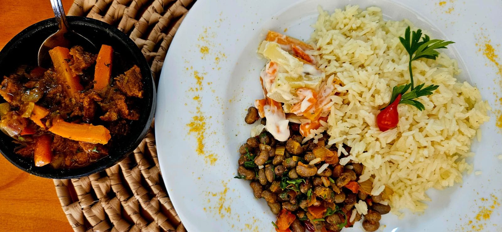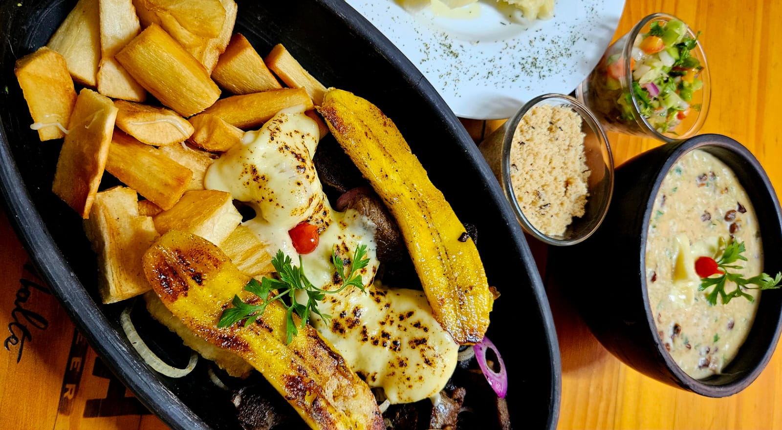 Carne de Sol Ôxe Dona Maria: macaxeira, queijo coalho, banana da terra, baião de dois e farofa