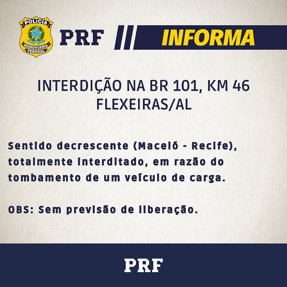 De acordo com informações da PRF, o veículo estava com uma carga de móveis e o tombamento bloqueou a BR no sentido Recife. Para retirá-lo, é necessário um outro veículo que está chegando no local. Ainda não há previsão de horário para liberação da pista.