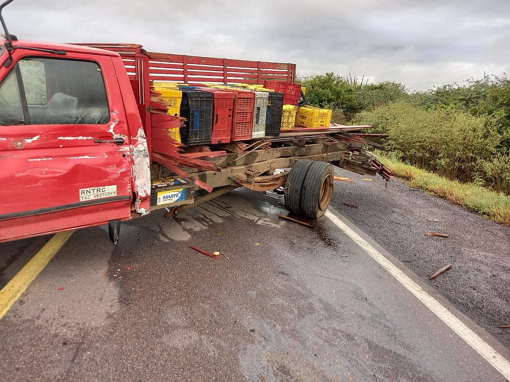 Ainda segundo os Bombeiros, o caminhão estava atravessado no meio da rodovia com a parte lateral da carroceria destruída.