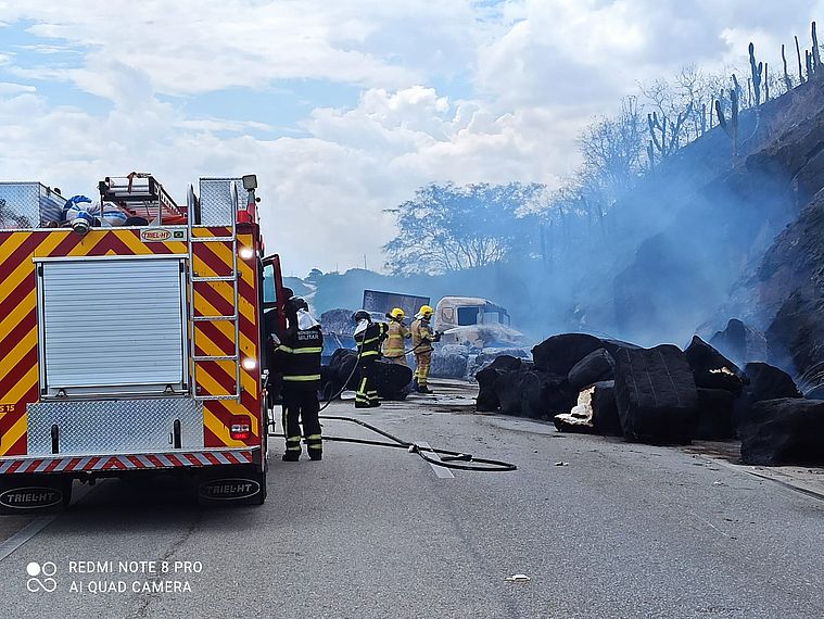 O Corpo de Bombeiros também foi acionado e enviou oito militares em duas viaturas ao local. Imagens divulgadas pela PRF mostram que toda a carga da carreta ficou espalhada pela rodovia.