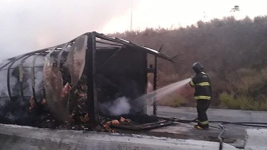 Uma carreta que carregava biscoitos tombou e pegou fogo na BR-104, próximo ao município de Messias, na tarde de quarta-feira (04).