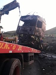 O motorista da carreta foi socorrido pelo Serviço de Atendimento Móvel de Urgência (Samu), e conduzido pela aeronave Falcão-05, do Grupamento Aéreo.
