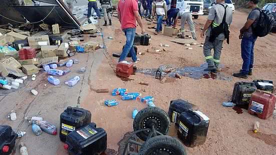 O veículo transportava gêneros alimentícios, além de óleo lubrificante. A carga ficou espalhada pela rodovia, que precisou ser interditada para a retirada do veículo e da carga espalhada.