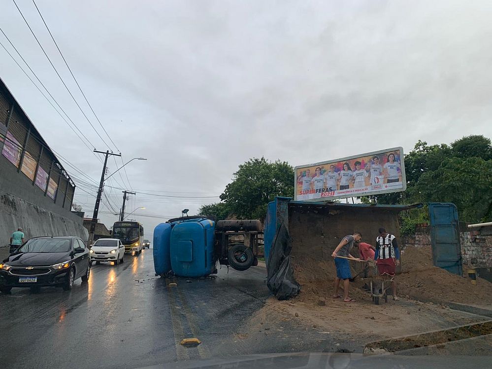 Segundo informações do condutor, a caçamba do caminhão teria virado no momento em que o barro era despejado na calçada. O automóvel ficou com a parte de trás tombada, atravessada em uma faixa da via, e a cabine ficou destruída.