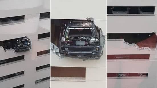Um carro bateu contra a parede do 14º andar de um estacionamento de um edifício no centro do Rio de Janeiro na última terça-feira (20).
