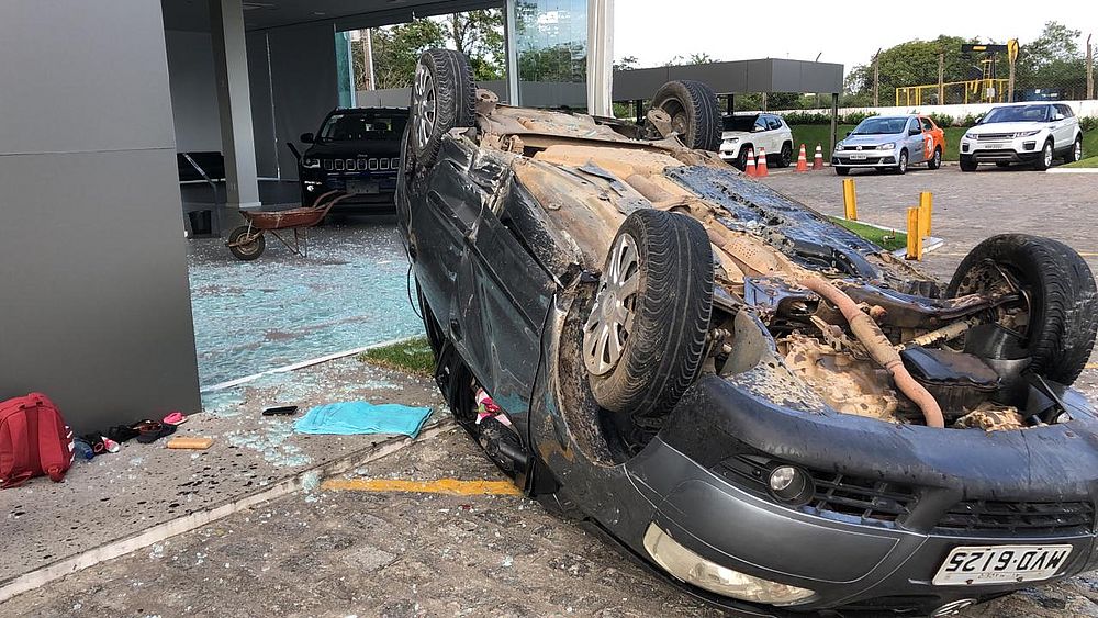 Após capotar, o carro bateu em uma vidraça da concessionária, que ficou completamente destruída. Um casal e uma criança de um ano estavam no veículo, mas não tiveram ferimentos graves. A criança estava na cadeirinha própria para automóvel.