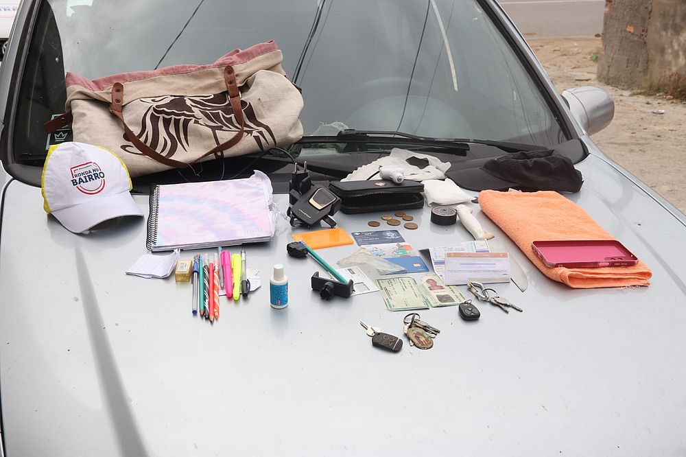Dentro do veículo, foram encontrados a faca peixeira utilizada para o assalto, RG de uma mulher, CPF, cartão Bem Legal para transporte público de Maceió, conta de energia, moedas entre outros pertences.