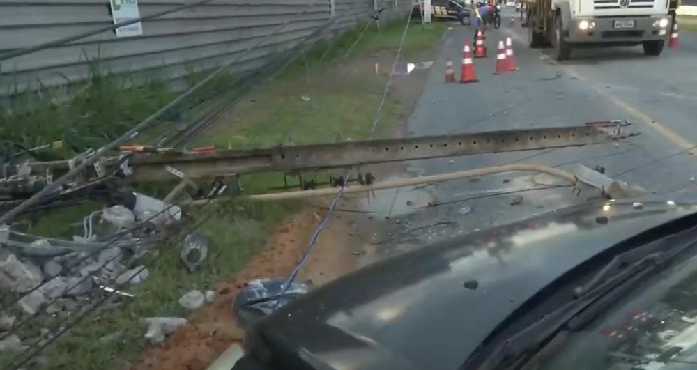 A suspeita foi de que o motorista perdeu o controle direcional, saiu da pista e bateu de frente com o poste. A estrutura caiu e um segundo poste ficou danificado. Foi possível observar fios pendurados e derrubados na avenida.