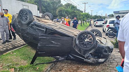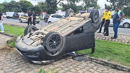 Um dia após um motociclista morrer por se chocar com ônibus, mais um acidente de trânsito foi registrado na Avenida Durval de Góes Monteiro, parte alta de Maceió. Desta vez, dois carros bateram e um deles tombou próximo de um canteiro às margens da pista, nas imediações do Campo Santo Parque das Flores, no Canaã. Felizmente, não houve feridos.