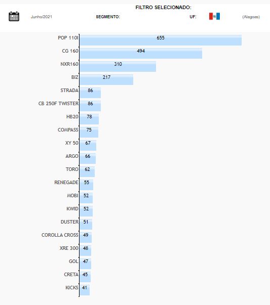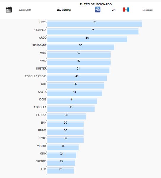 No estado, o modelo mais vendido foi o Hyundai HB20 com 78 unidades emplacadas em junho. O Jeep Compass, que havia sido o líder estadual de junho, ficou na segunda posição esse mês com 75 unidades vendidas no estado. 3 a menos que o HB20.