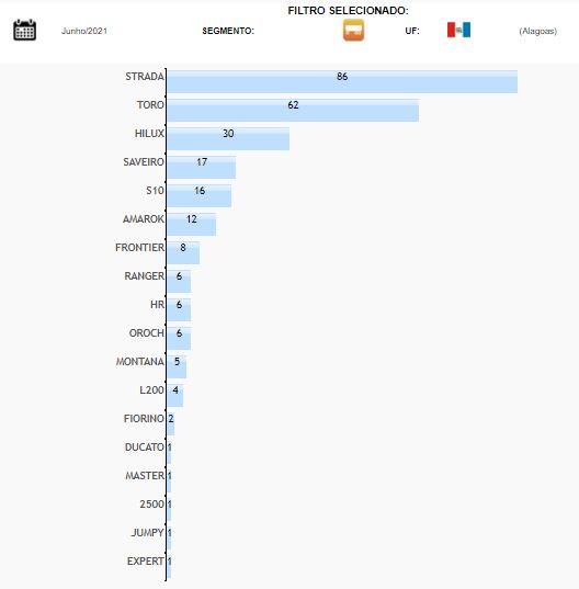 Entre os comerciais leves, a Fiat segue também absoluta com Strada e Toro. Entre as picapes maiores a Toyota Hilux foi a campeã. veja:
