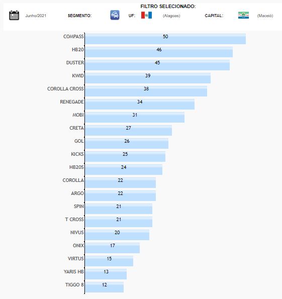 Já na capital o Jeep Compass manteve a liderança de maio e ficou em 1º com 50 unidades emplacadas contra 46 do Hyundai HB20 que ficou na 2ª posição.
