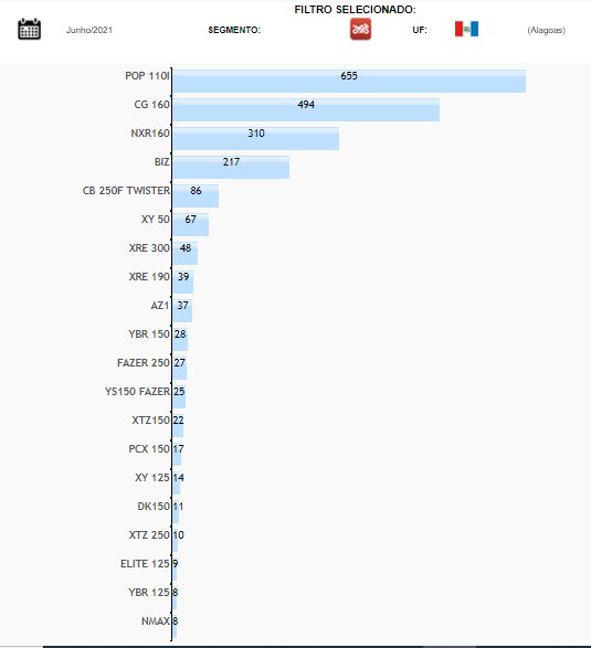 Entre as motos a Honda segue absoluta com a POP 110i com 655 unidades emplacadas seguida pela CG 160 com 494 e NXR 160 com 310. Confira o Top 20:
