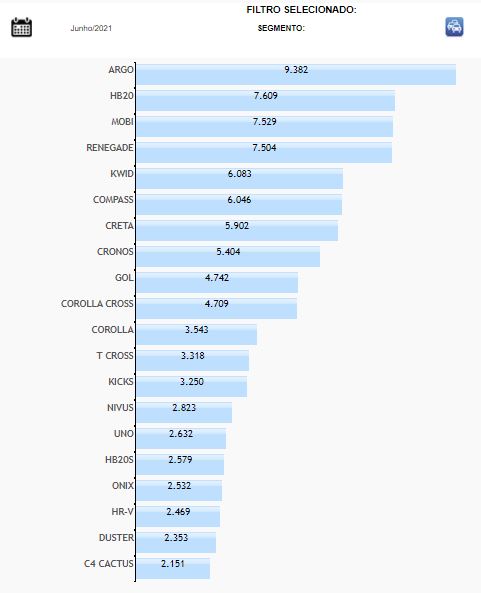 Analisando os números de todos os estados, a liderança absoluta ficou com o Fiat Argo com 9.382 e briga foi acirrada pelo segundo lugar com HB20, Mobi e Renegade na casa dos 7.500 emplacamentos.