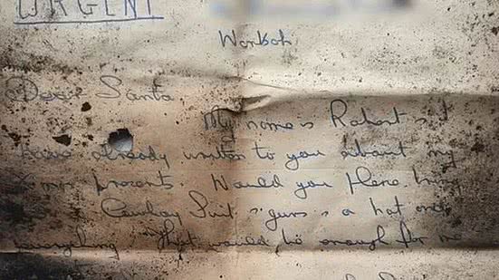 Chamuscada e cheia de fuligem, a carta - marcada como "urgente" -, foi encontrada alguns meses atrás por uma empresa de limpeza de chaminés na cidade de Worksop, no norte do país, a cerca de 240 km de Londres. Na mensagem, Robert Crampton pedia uma "roupa de cowboy e revólver e chapéu e tudo mais", acrescentando: "Isso seria o suficiente pra mim, Papai Noel".
