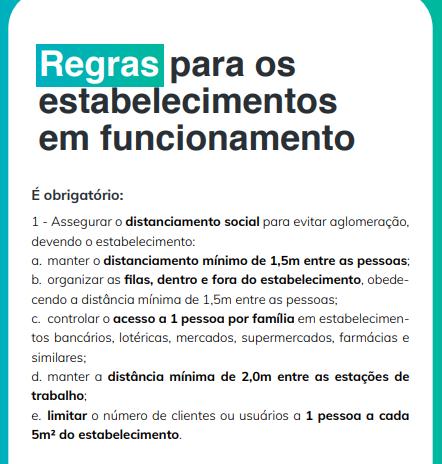 É obrigatório assegurar o distanciamento social para evitar aglomeração, devendo o estabelecimento: manter o distanciamento mínimo de 1,5m entre as pessoas, organizar as filas, dentro e fora do estabelecimento, obedecendo a distância mínima de 1,5m entre as pessoas, controlar o acesso a 1 pessoa por família em estabelecimentos bancários, lotéricas, mercados, supermercados, farmácias e similares, manter a distância mínima de 2,0m entre as estações de trabalho e limitar o número de clientes ou usuários a 1 pessoa a cada 5m² do estabelecimento.