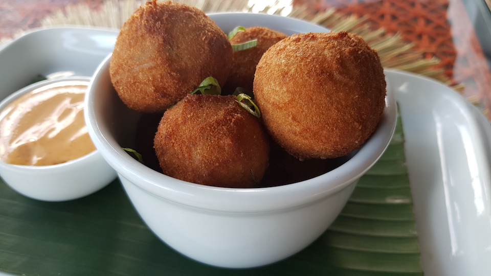 Para petiscar – Bolinho de polvo com maionese de páprica e a tulipa de frango (coxinha da asa) com molho de acerola.