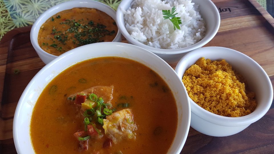 Compartilhar – O chef Antonio Mendes fez consultorias em vários restaurantes de fruto do mar, e juntou as suas experiências na receita de moqueca de camarão e peixe. “Eu fiz uma base de moqueca com caldo de camarão, legumes, leite de coco e azeite de dendê”, diz o chef. A moqueca de camarão e peixe é servido com pirão e arroz,