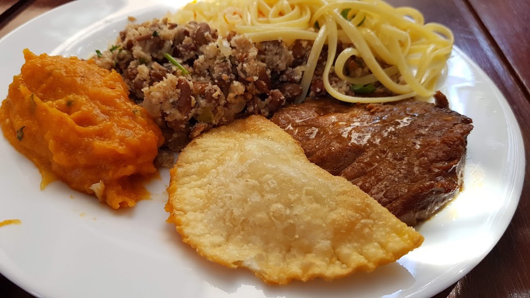 Pastel de queijo, purê de abóbora, macarrão e bife de panela