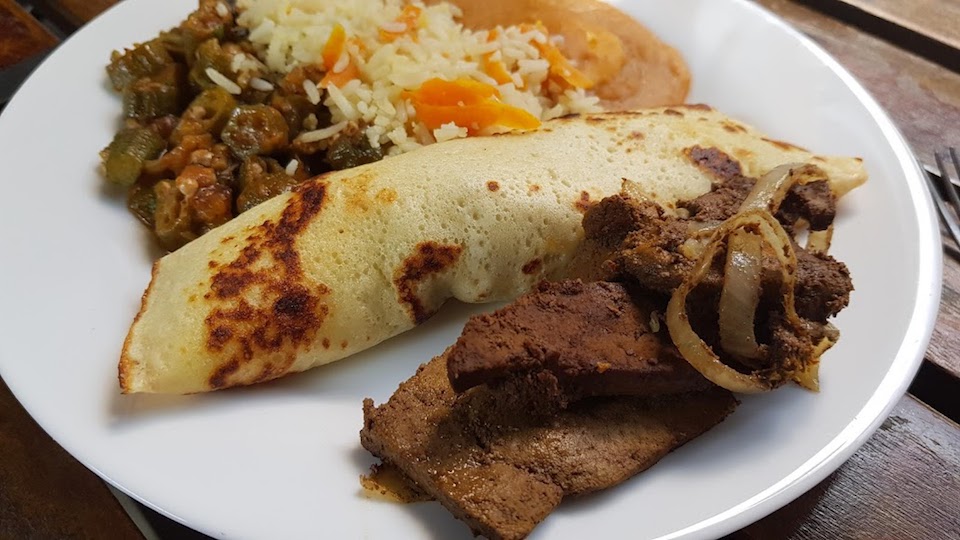 Fígado acebolado, panqueca de carne, quiabo refogado, arroz e tutu de feijão