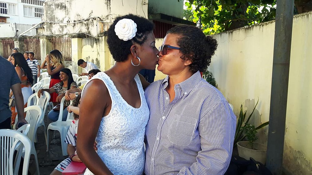 “Eu a encontrei pela primeira vez quando atuava como técnica da Seleção Alagoana de Futsal Feminino para Surdas. A gente foi se conhecendo melhor e surgiu o namoro. Há quatro anos moramos juntas e idealizamos essa ideia de união. Hoje é um dia que marca nossas vidas”, disse Betânia. “Eu quero que ela seja minha esposa para o resto da vida”, completou.