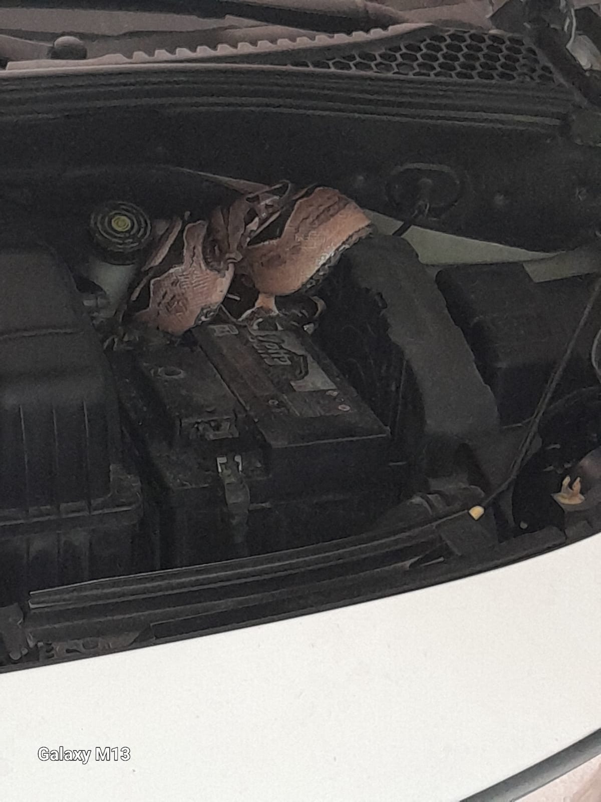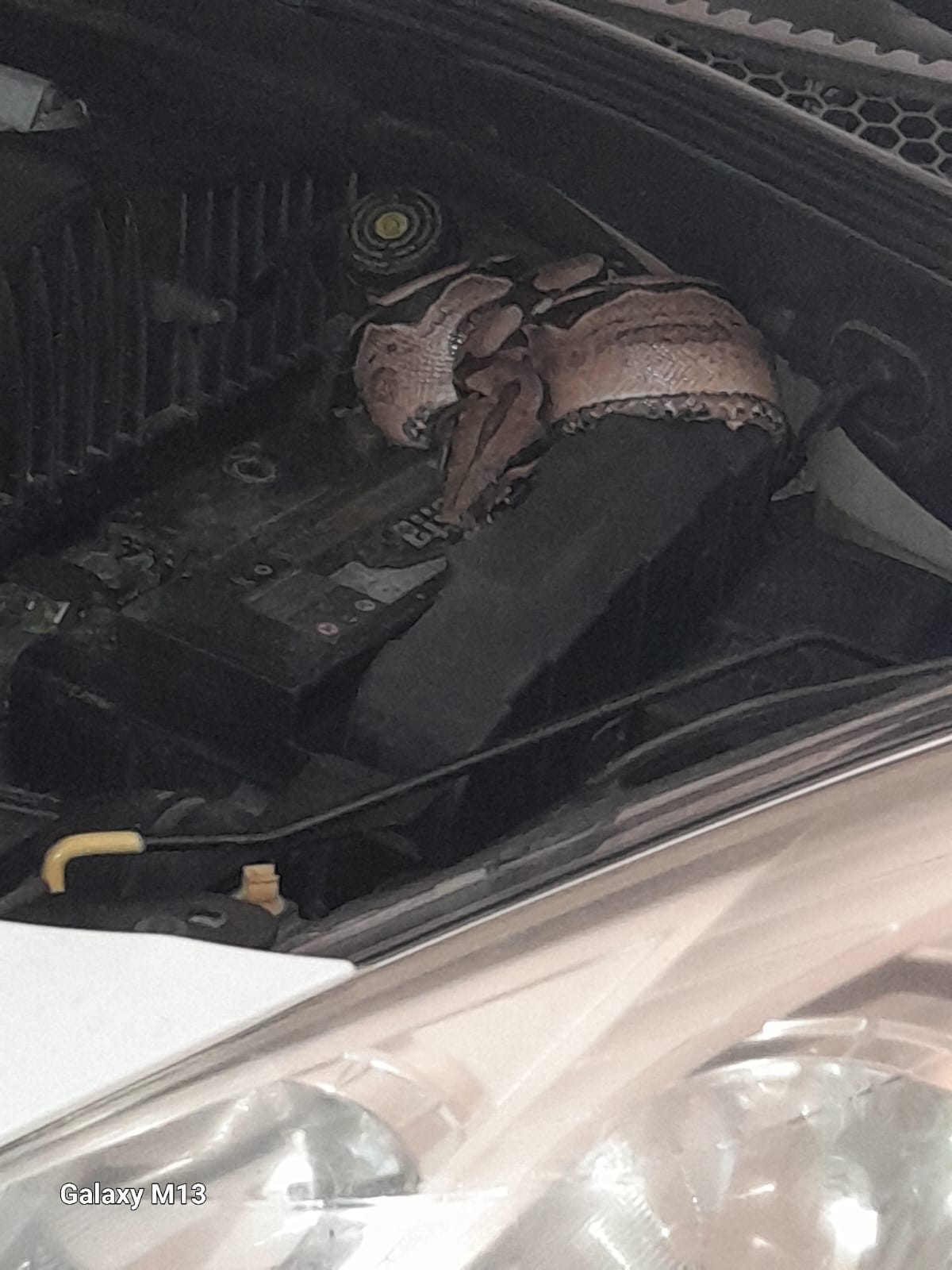 Imagens enviadas à reportagem do TNH1 mostram o réptil, que pode medir cerca de quatro metros e pesar mais de 45 quilos, enrolada sobre a bateria do veículo, um Citroën de cor branca.