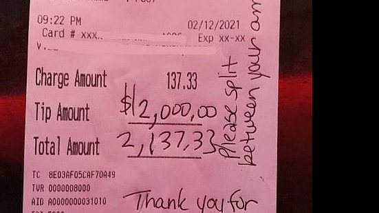 Agenerosidade de um casal surpreendeu completamente os trabalhadores do restaurante Club Lucky, em Chicago, nos Estados Unidos, na última sexta-feira (12): homem e mulher consumiram US$ 137 (equivalente a R$ 735) em comida, mas deixaram uma gorjeta de US$ 2 mil (R$ 10 mil) para o estabelecimento.