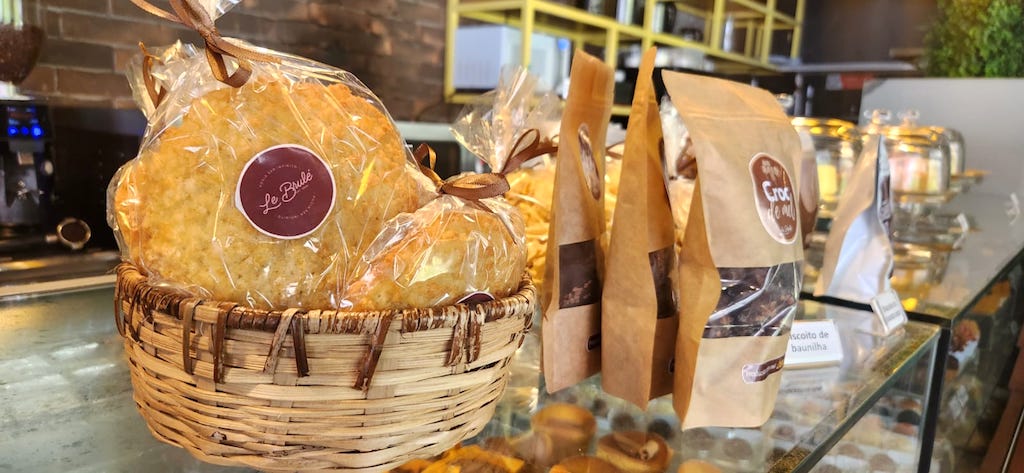 E para acompanhar? Pode ser uma fatia de bolo de laranja ou de chocolate, uma brasileira, ou um tostex de queijo com presunto… Aliás, no Le Brulé fica até difícil de escolher o que comer, porque são muitas gostosuras. O croc Le Brulé é o pão de forma recheado com queijo provolone, mussarela, catupiry e presunto. Um espetáculo! Também tem o crossaint que segue a receita francesa e pode ser recheado ou simplesmente puro!