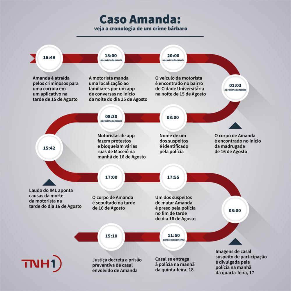 Para entender melhor como foi a dinâmica da morte de Amanda, o TNH1 se aprofundou no trabalho de investigação e refez o passo a passo do crime. A cronologia abaixo foi montada a partir dos relatos de familiares da motorista e de informações confirmadas pela Polícia Civil alagoana.