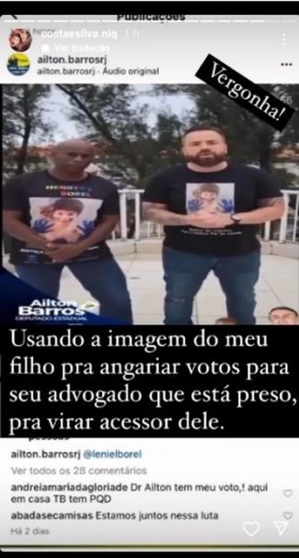 Nos prints anexados ao documento, há mensagens que atribuem a ele o rótulo de "omisso". Em outra imagem, a postagem atribuída a Monique trata como "vergonha" uma postagem de Leniel ao lado do advogado Ailton Barros, que foi candidato a deputado estadual nas últimas eleições, em que o pai de Henry estaria "usando a imagem" de Henry para "angariar votos".