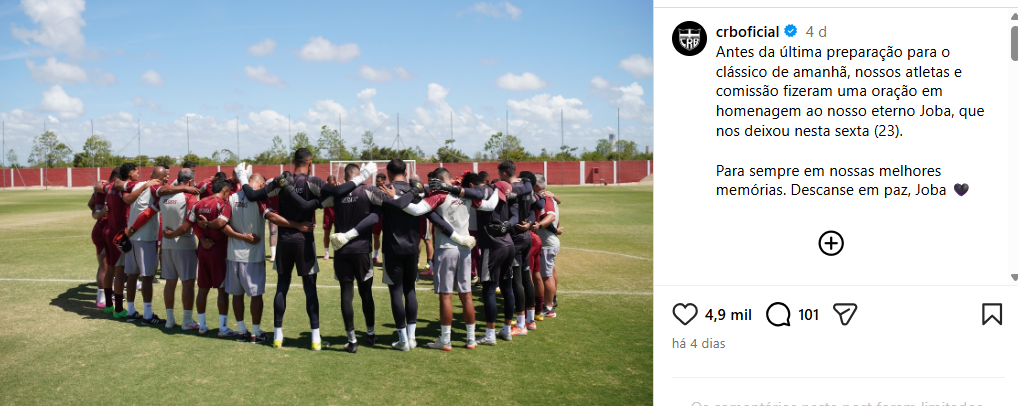 Antes do início do clássico entre CRB e CSA, na tarde do último sábado (24), os jogadores dos dois clubes se uniram para homenagear Joba. Antes do ínicio da partida, no Rei Pelé, balões com as cores brancas foram soltos pelos atletas das duas equipes e por familiares do coordenador de base.