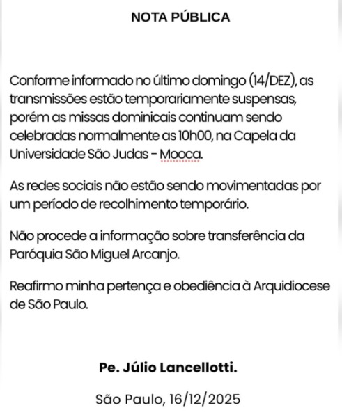 Por fim, o sacerdote reafirmou sua obediência ao que for determinado pela entidade que administra a igreja católica em São Paulo.