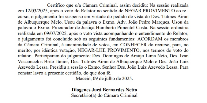 A primeira sessão deste último recurso aconteceu no dia 12 de março deste ano, ocasião em que o julgamento foi suspenso após pedido de vista do desembargador Tutmés Airan. Em sessão ordinária realizada nesta quarta-feira, o voto vista do desembargador acompanhou o entendimento do relator em negar o recurso por unanimidade.