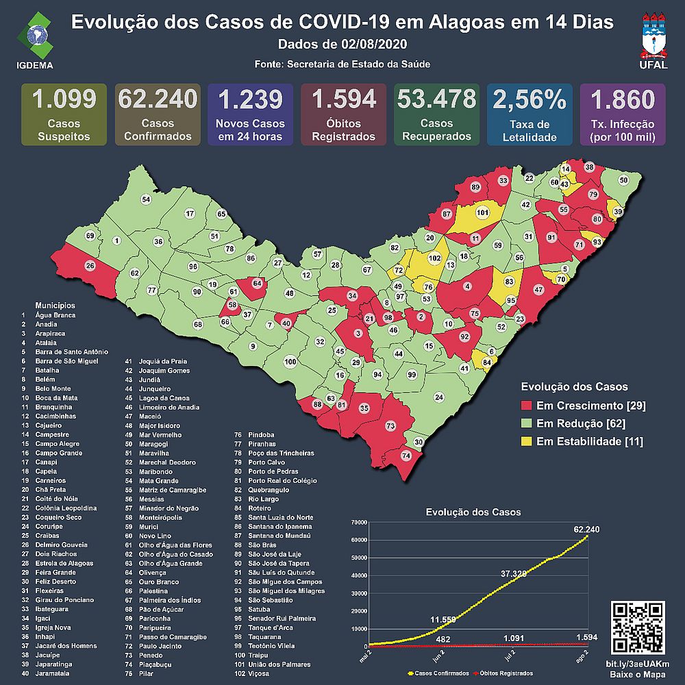 O estudo se refere à 31ª semana epidemiológica e analisou os dados de todas as regiões de saúde de Alagoas, exceto a 1ª Região, da qual faz parte Maceió. Segundo estudo, não foram 'observadas evidências consistentes de controle considerando os últimos quatorze dias'.