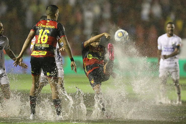 - Durante o intervalo da partida, a chuva que caía em Recife piorou. O gramado se transformou em uma piscina, e o jogo foi paralisado aos 16 minutos do segundo tempo.