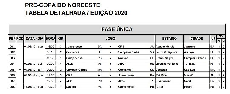 A Confederação Brasileira de Futebol definiu nesta quinta-feira (25) as datas dos confrontos da pré-Copa do Nordeste 2020. O CRB pega o Juazeirense na próxima quarta-feira, dia 1º de maio, às 16h, no Estádio Adauto Morais, em Juazeiro, na Bahia. O duelo de volta será na quarta-feira, dia 8, às 19h30, no Estádio Rei Pelé, em Maceió. A equipe que se classificar vai para a fase de grupos do Nordestão.