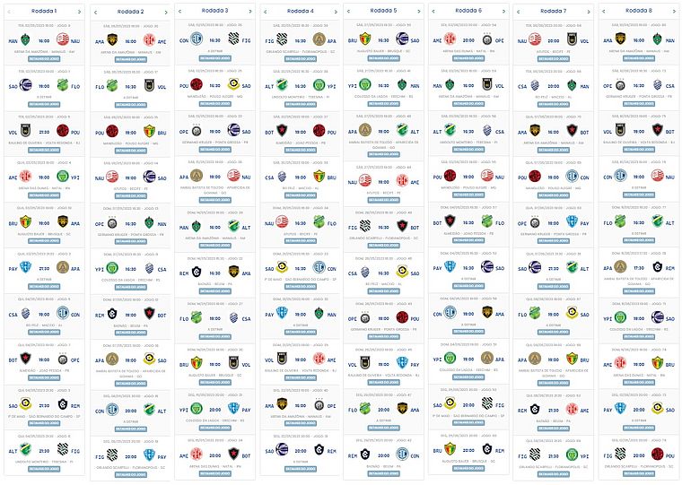 A Confederação Brasileira de Futebol (CBF) divulgou, na última sexta-feira, as datas e os horários das oito primeiras rodadas da Série C do Campeonato Brasileiro 2023. Veja lista detalhada com as partidas do CSA e todos os confrontos na imagem abaixo.