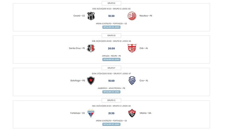 A Confederação Brasileira de Futebol divulgou nesta segunda-feira (1º) as datas dos confrontos das quartas de final da Copa do Nordeste 2019. O CRB enfrenta o Santa Cruz neste sábado (6), às 20h, no Estádio do Arruda, no Recife. O CSA vai encarar o Botafogo-PB no domingo (7), às 18h, no Estádio Almeidão, em João Pessoa.