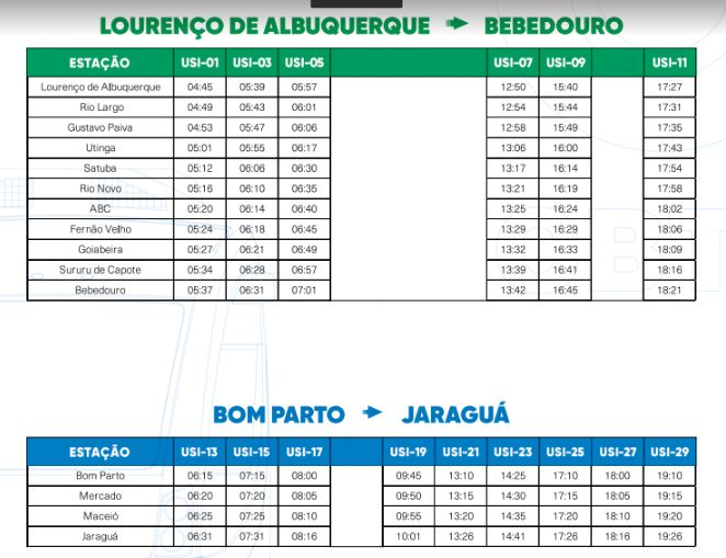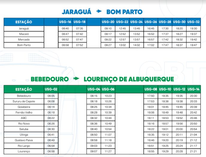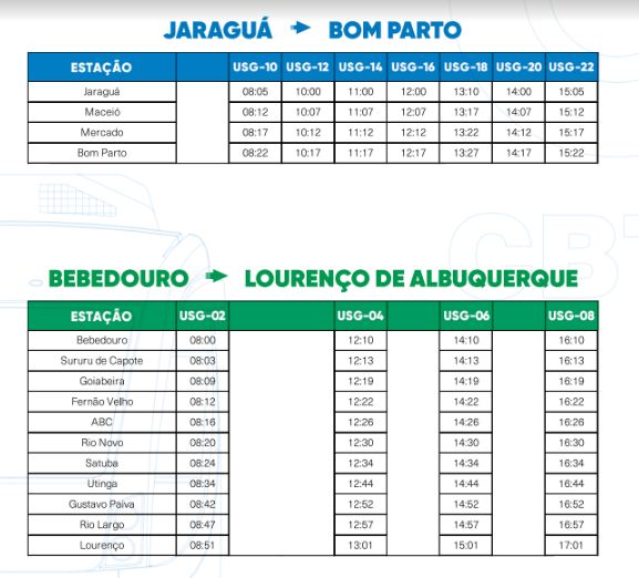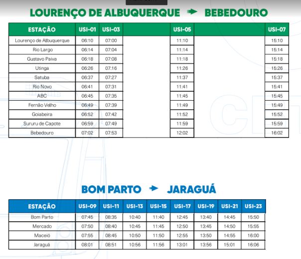 A Companhia Brasileira de Trens Urbanos (CBTU) informa, que a partir desta quarta-feira, dia 1º de abril, as operações ferroviárias terão nova grade de horário entre os bairros de Jaraguá e Bom Parto e Lourenço de Albuquerque e Bebedouro, em razão da suspensão dos serviços entre Bebedouro e Bom Parto recomendada pela Defesa Civil do município de Maceió.