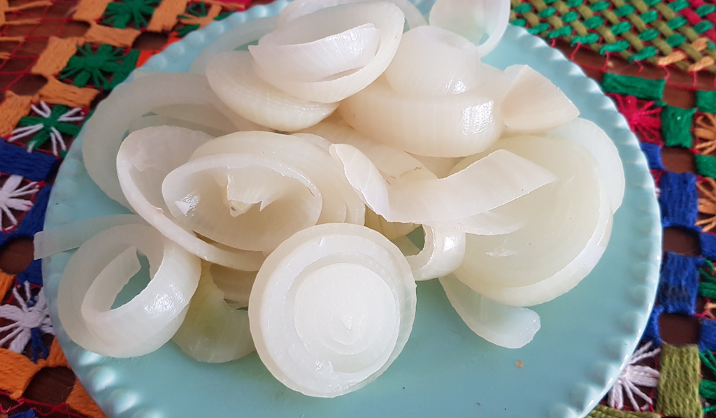 Corte as cebolas em rodelas grossas. Cozinhe-as na água com sal até ficarem transparentes e reserve.