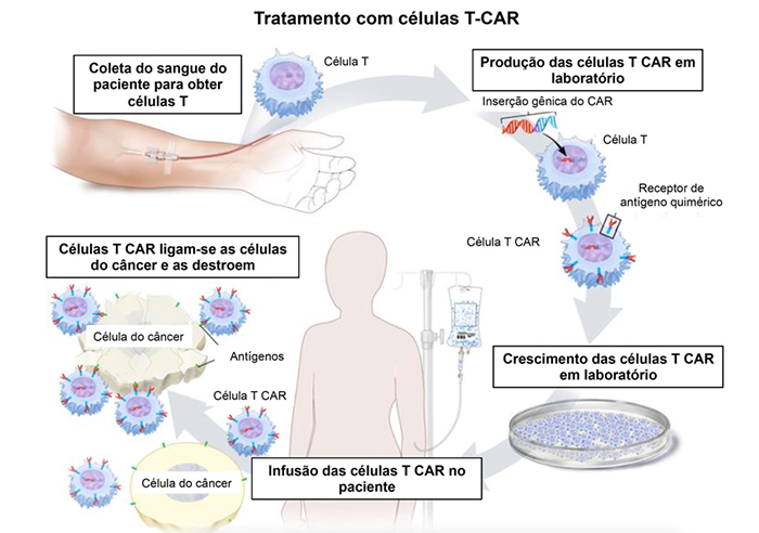 Os leucócitos reprogramados são “expandidos” em laboratório (colocados em meio de cultura para que se proliferem) e depois infundidos no paciente. Antes do tratamento, uma leve quimioterapia é administrada para preparar o organismo.