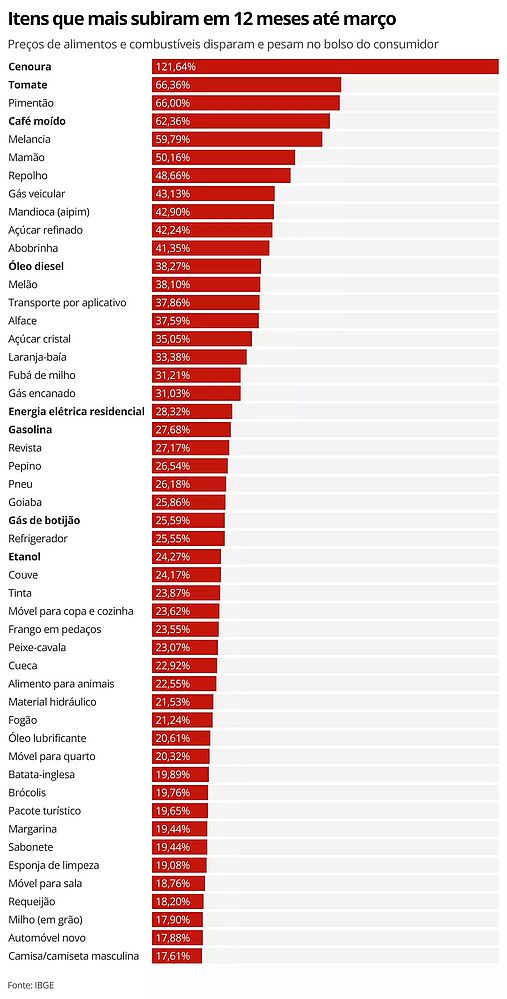 No caso da cenoura, a alta já passa de 120% em 12 meses. Já os preços do tomate e do café saltam mais de 60%. Nos combustíveis, o diesel acumula aumento de 38,27% e gasolina, de 27,68%.